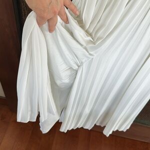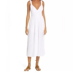 This Vince pleated romper in pure white features a sleeveless design with a flattering V-neckline. Its midi length and airy fabric make it ideal for weddings or resort wear, offering a graceful and minimalist style.