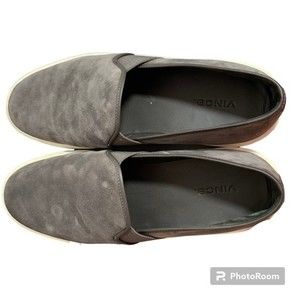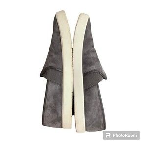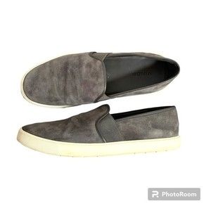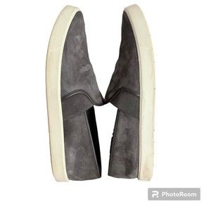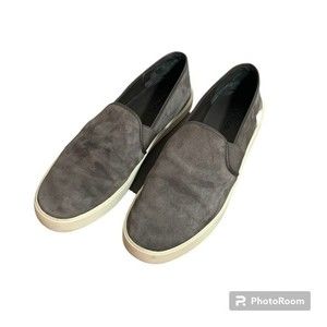 Picturing the Preston Slip On Sneaker from Vince, suede upper in the color steel gray, size 9.