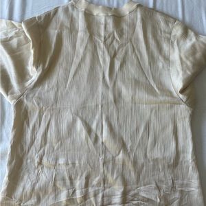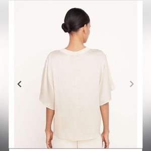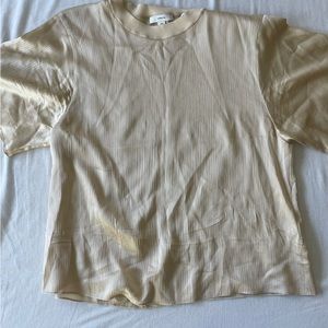 “Our easy textural silk flutter sleeve shell is finished by a ribbed crew neckline.