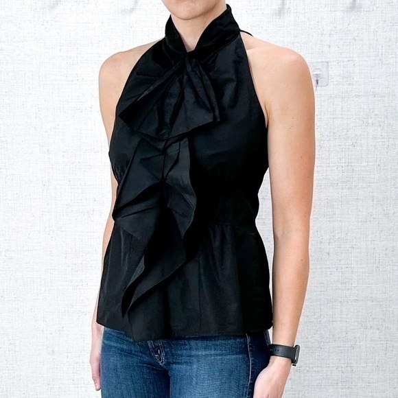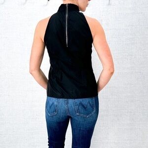 Sleeveless, high neck, feminine ruffles, exposed zipper in the back. Super cute and polished look.