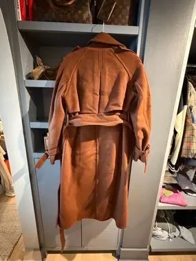 Vince long wool-blend coat in a warm rust-brown shade with belt. Features clean tailoring and a smooth finish. Timeless, versatile outerwear piece.