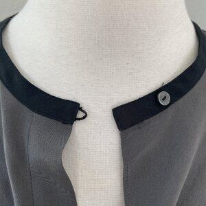 Color: Gray front and sleeves with black collar trim and black back; subtle high low hem.