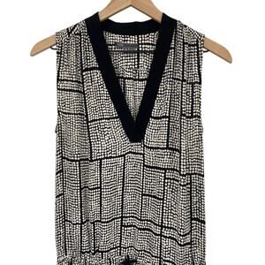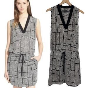 Vince Silk Mini Dress V Neck Blouson Drawstring Waist Black White Polka Dot XS