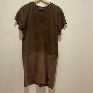 Vince Size XS Brown Green Genuine Leather V-Neck Shift Dress Pockets
