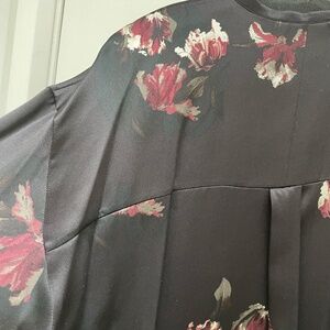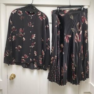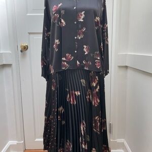 100% Silk Vince skirt and blouse co-ord, size L, fits like a 10-12. Knife pleat midi skirt with additional kick pleat/faux wrap in coordinated flower petal fabric both front and back. Side closure with invisible zipper, hook and bar closure, and two pockets!