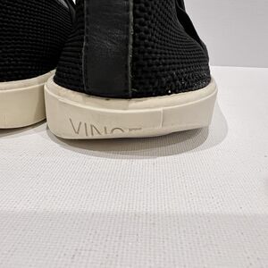 Vince Preston 3 Slip-On Mesh Sneaker Black/White. Women's Size 9.5. There is a lot of wear to the soles at the bottom and the back of the heel. There are some marks inside the insole. There is some color loss to the piping.