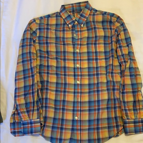 Beautiful spring button down in orange blue and yellow plaid. Slight wear on the armpit, a perfect daytime casual shirt under a blue blazer or just with jeans.