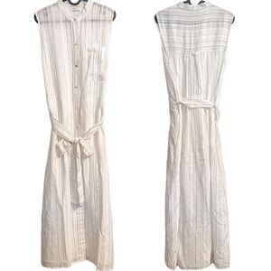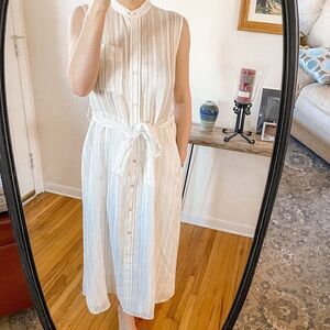 Features: sleeveless, partially lined, front button closure, high mock neck, single chest pocket, self-tie belt, side pockets, midi length, white black stripe