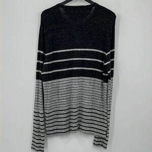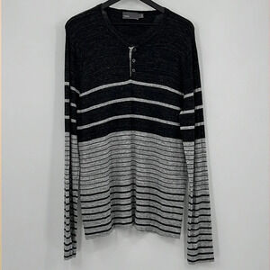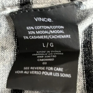 Vince Striped Long Sleeve Henley Cashmere & Modal - Size Large. Great pre-owned condition. Cotton, modal, cashmere blend. Verrrry soft. 3 button henley,, long sleeves. Colors are black and gray. Approximate measurements: 21 1/2" pit to pit, 31" length.