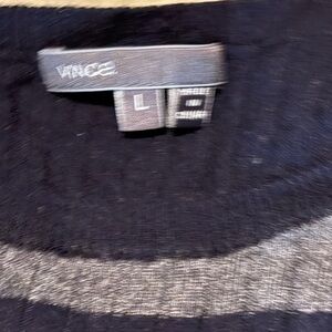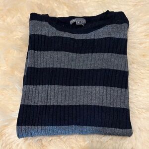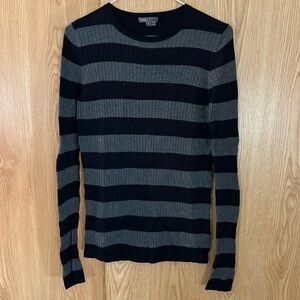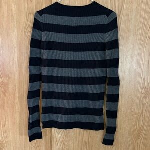 This sweater is super cute and flattering, practical to match many outfits in black and gray stripes, with stretch for comfort, in great condition. The size is marked as large, but fits a size extra small.