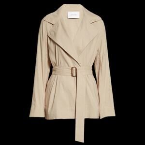 Notched lapels; one-button front. Long sleeves; tabbed button cuffs. Dropped shoulders. Side slip pockets. Straight fit. Hits below the hips.