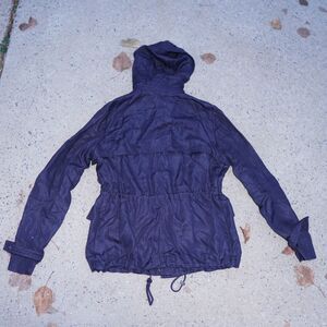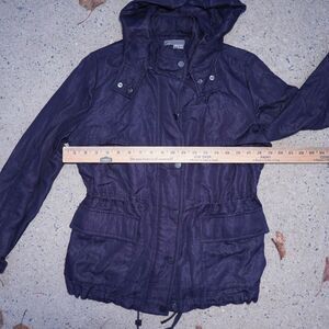 The jacket is designed with a removable hood and practical features including multiple pockets, both zipper and snap closures, and an inside drawstring adjustable waist to customize the fit. While tagged as an XS, this style runs big and can comfortably fit a Small (Size 4-6), making it an excellent layering piece for Fall.