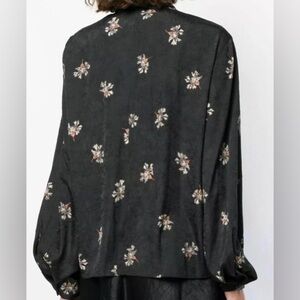 The tie neck popover is done in crinkled crepe de chine and printed with tossed florals. Quiet details include a wrap-effect neckline, envelope sleeves and split back detailing.
