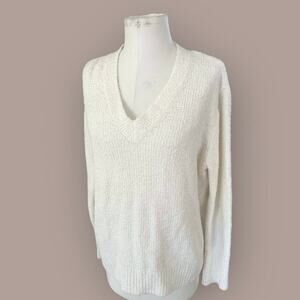 Gorgeous, super soft Vince V-neck sweater in a pretty creamy white. Cotton blend, slightly oversized fit. Women's size XL. Please see measurements below. This sweater is in very good preowned condition with no flaws or issues.