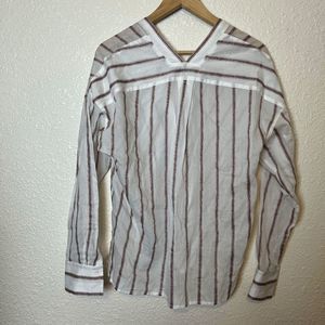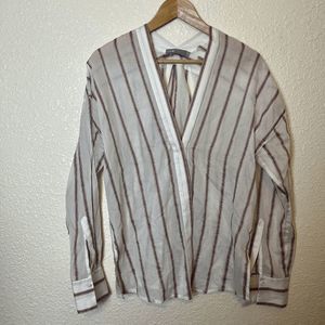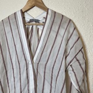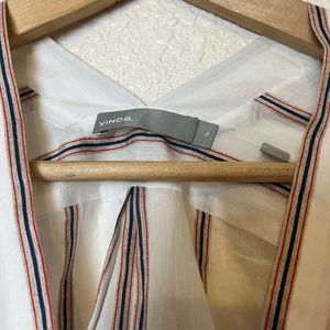 Stylish Vince blouse with white and gray stripes. Perfect for casual outings.