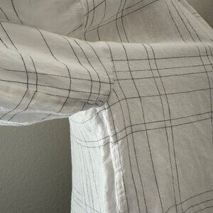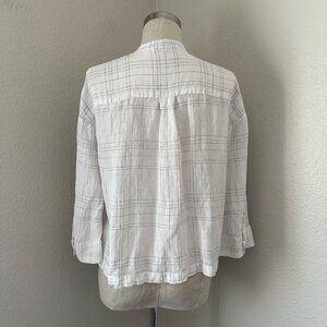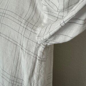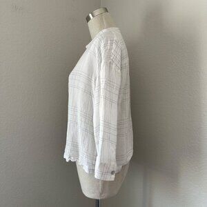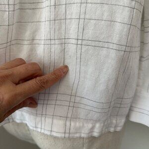 Vince popover blouse with split round neckline and long cuffed sleeves. White color with window panel stripes in grey color. Is linen viscose blend, airy, lightweight, semi sheer. This blouse presents some flaws, please see last four pictures for reference.