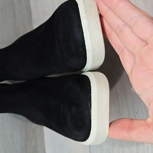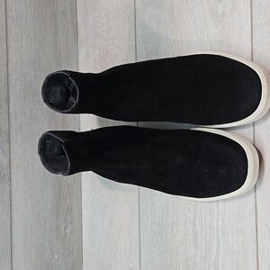 Stylish black suede ankle boots with a contrasting cream sole. Perfect for casual wear.