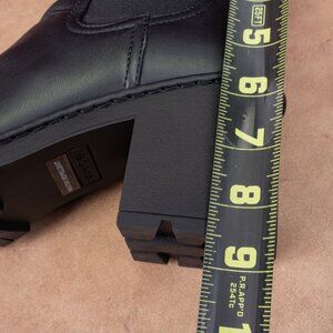 Crafted from premium waterproof black leather, this chic boot features a trendy chunky lug sole and a comfortable block heel. The ultimate blend of modern utility and effortless luxury.