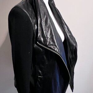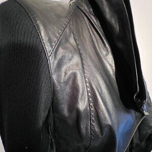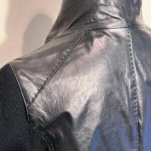 Vince black wool inset and wool sleeve lamb leather black leather jacket. Has shine to the leather, and pick-stitch detailing throughout the leather. Thick sweater wool sleeves, as well as side panels allow for give when wearing. Double zipper. Jacket has two layers of leather on the stand up collar for nice effect, and collar can lay down to give it a more asymmetrical look. More of a modern look overall. Been worn, but in excellent condition, with no flaws or visual defects. Side pockets, and lined in cotton. Medium fits an 8, possibly a 10.