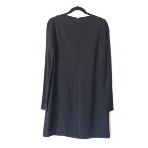 This Vince black long-sleeve dress offers a timeless and professional aesthetic with its sleek A-line silhouette and discreet back zipper closure.