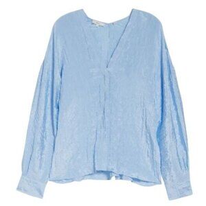 Vince Women's Blouse Double V-Neck Crinkle Cerulean Blue Long Sleeve 2X NEW