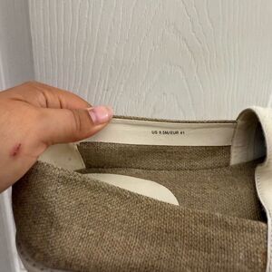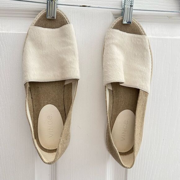 Step out in style with these Vince slip-on shoes. Featuring a chic cream/ white color, they offer both comfort and elegance for any occasion. Material is Italian calfskin hair in good condition has some wear see pictures but super cute perfect for summer since 9.5