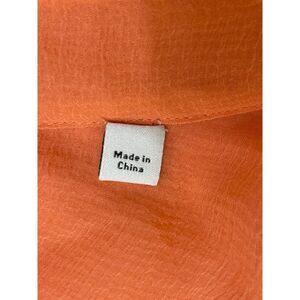 The Vince Women's M Orange Button-Up Polyester Shirt is a stylish and versatile addition to any woman's wardrobe. This chic top features a collared neckline and button closure, making it perfect for casual occasions. The semi-sheer design and lightweight material make it ideal for summer, fall, and spring. With its solid color and classic style, this shirt can be dressed up or down for various outings. The built-in bra and easy care instructions ensure both style and comfort for the modern woman.