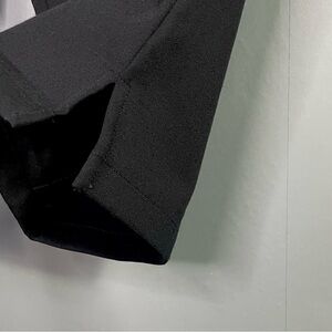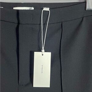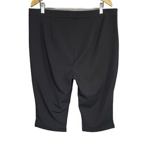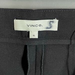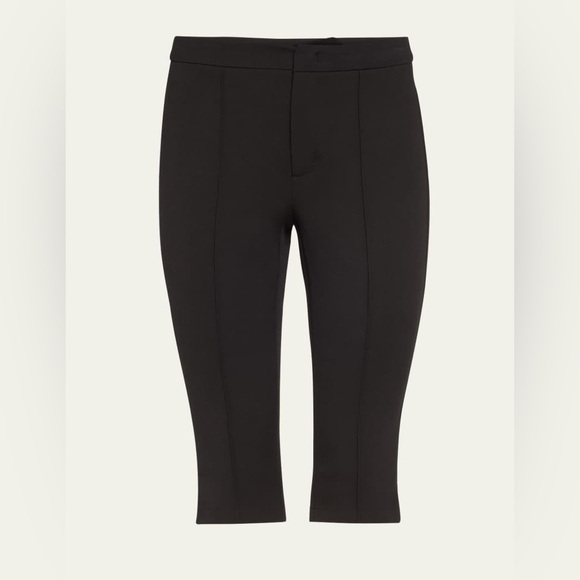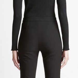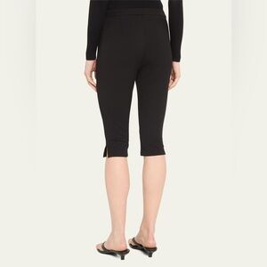 Vince Women's Plus Slim Fit Capri Pant. In black. Zip fly with hook closure. Stitch crease detail on front legs. Side slits at hem. Cotton, polyamide, and elastane blend.