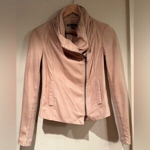 Elegant tan with a bit of blush/peachy tint leather jacket by Vince. Features a chic draped collar and zip closure.