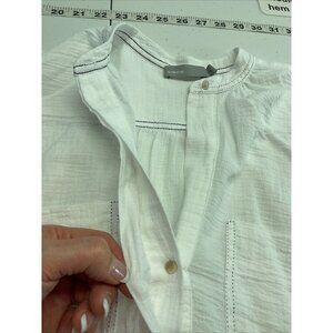Elevate your wardrobe with this stunning Vince women's blouse. Crafted from 100% cotton guaze, this white top features an oversized fit with a boxy silhouette. The short sleeve blouse has a pullover closure and is adorned with hidden buttons and pockets for added style and convenience.
