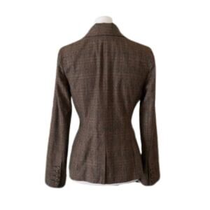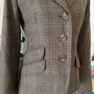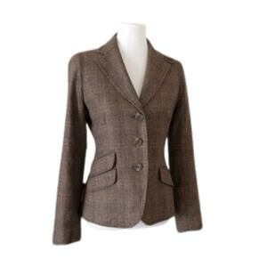 Vince wool–cashmere blazer in a classic brown glen check. Tailored cut with structured shoulders, defined waist, and notched lapels. Fully lined with a three-button closure and flap pockets. Size 8. Excellent condition.