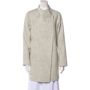 Vince light grey wool coat. Can snap all the way up, or worn open with chic drape effect. Slight A-line. Stand collar.