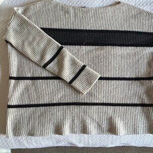 Striped/neutral Vince pullover. Sleeves are tapered and sweater widens out towards the lower hem. Label and tag have been damaged; I estimate a 70% wool blend. Very flattering and true to size
