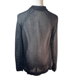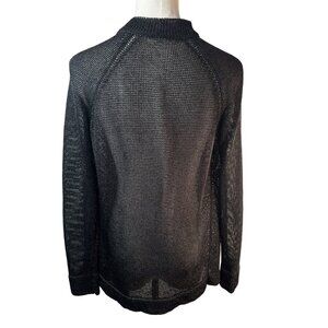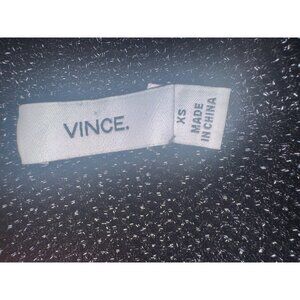 This Vince cardigan sweater features a metallic blend, offering an elegant drape and open front design. Its lightweight yet stylish composition is perfect for layering. Vince cardigan, XS sweater, metallic cardigan, black drape top, open front sweater, lightweight cardigan, Vince apparel, chic layering piece, women's fashion, stylish sweater, Vince XS, drape cardigan, elegant black cardigan