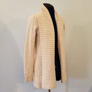 Shawl collar - Long sleeves - Open front - 2 front on-seam pockets - Cable knit construction - Ribbed knit trim