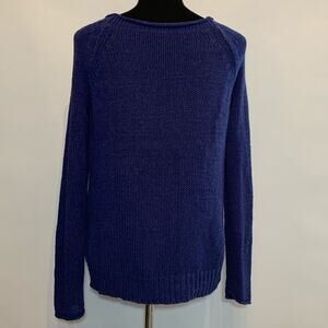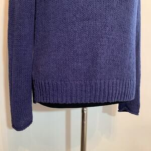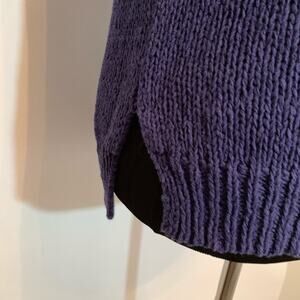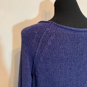Vince blue crewneck knit sweater. Ribbed neckline and hemline. Slightly rolled neckline in back. Side split hemline. Size XS. Excellent preowned condition. Minor wash wear.