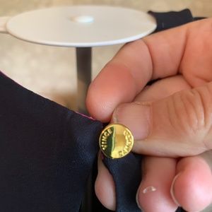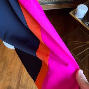 Lovely colors and very versatile. Navy, with pink snd orange at the swing part. Gold button closure