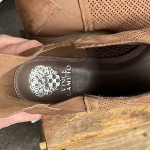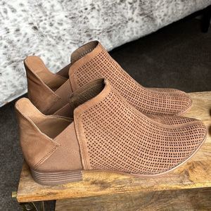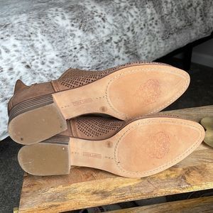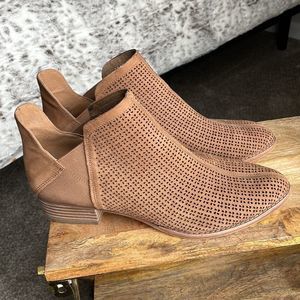 Vince camuto leather laser cut brown ankle pull on bootie boots