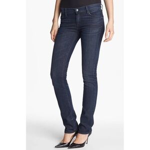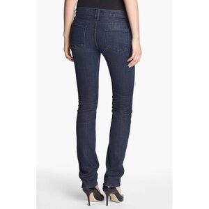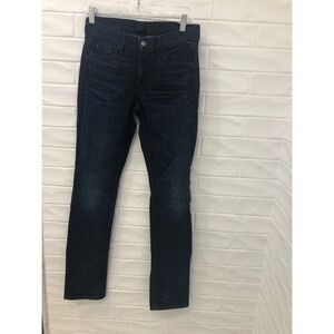Whiskered and crosshatched denim adds weekend-ready ease to lean, dark-rinse jeans.