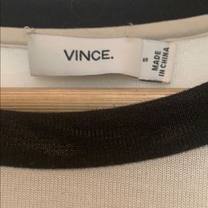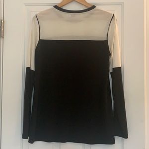 Vince navy, black, and cream colorblock long sleeve top. Light wear. One small spot where it got stuck in a zipper creating a small hole (shown in picture), however as this is at the left hip at the hem it is not noticeable when worn.