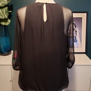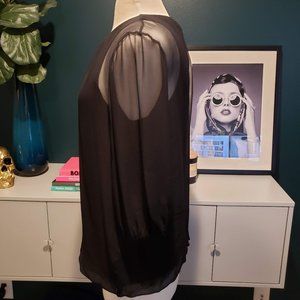 Sheer 3/4 sleeves with solid tank underneath. Goes with everything. Easy to dress up or down.