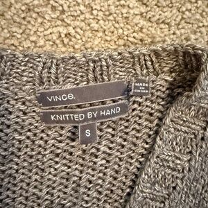 This is a stunning women’s VINCE. “Knitted by Hand” Button Front Cardigan Sweater. It has a gray hand open knit material, long drop sleeves and a v neck oversized grampa style.