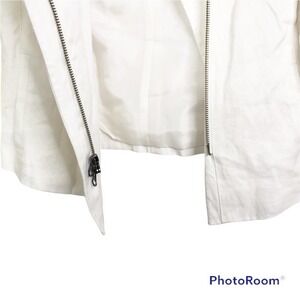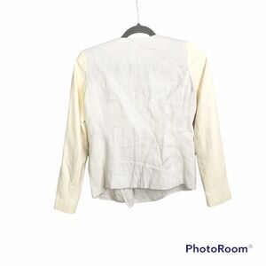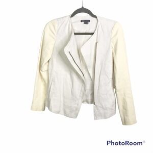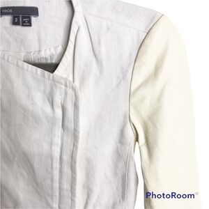 Vince leather and linen jacket. White linen bodice with cream leather sleeves. Asymmetrical hidden zip up closure.