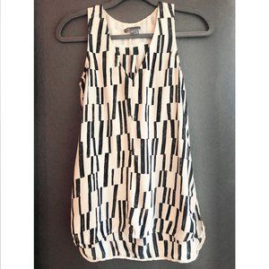 Sleeveless blouse with white and black broken stripes pattern. Very good used condition. Hi lo hem with slit in sides. 100% silk, V-neck. Pleated on back at shoulders. . No stretch. Beautiful soft drape.
