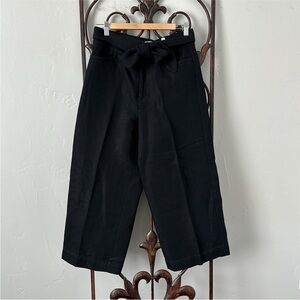 Black cotton-linen blend tie-front wide-leg trousers from VINCE featuring front tie fastening, slip pockets to the sides, two rear patch pockets, wide leg and cropped.