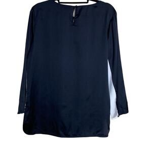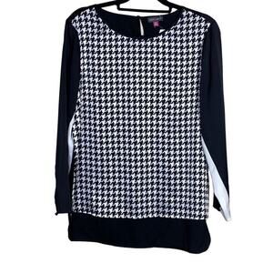 Vince Camuto Black and White Hi-Low Geometric Checkered Sheer Top Medium. Keyhole back closure, round neck, long sleeves.