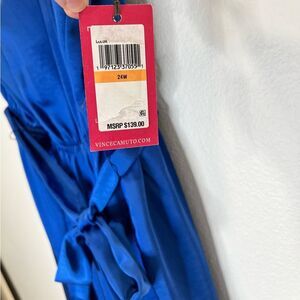 This Vince Camuto jumpsuit in a striking blue hue features a sleeveless design with high waistline accentuated by a tie belt. The wide-leg silhouette flows elegantly, offering a modern and versatile look for various occasions.