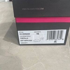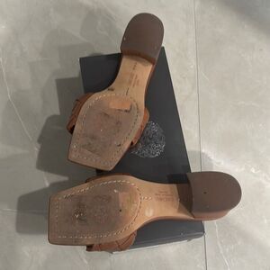 These Vince Camuto mules feature a rich brown leather upper with a stylish woven strap design. The flat sole and open back create a comfortable and elegant silhouette, making them perfect for casual to semi-formal occasions.