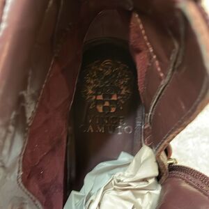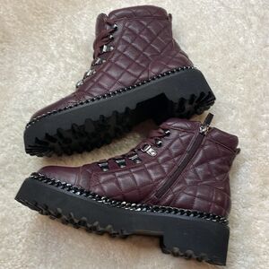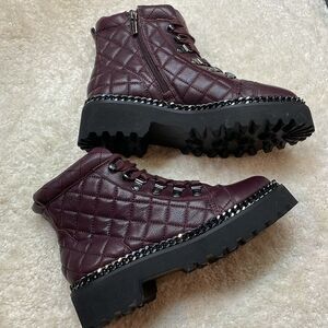 Make a bold statement with these Vince Camuto quilted leather boots. Crafted in a rich burgundy hue these boots featuring diamond quilted design, smooth, leather toe cap, and edgy silver-tone chain trim along the welt. The lace upfront and inside zipper offer easy wear, while the chunky lug sole provides excellent traction. Perfect for pairing with jeans, leggings, or a casual dress for a chic, rugged look. Excellent condition. Like new! Smoke free home. Fast shipping. Open to reasonable offers.