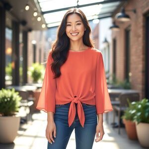 Featuring 3/4 sleeves, a chic tie-front bow, and a built-in tank liner for modesty, it’s the ideal top for elegant casual wear or day-to-night transitions.